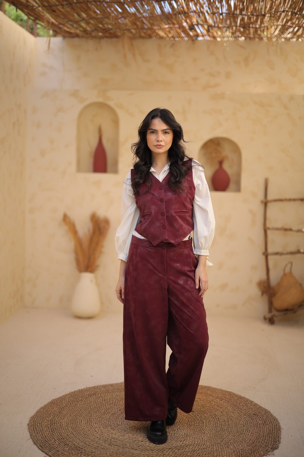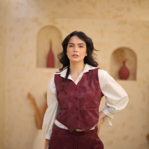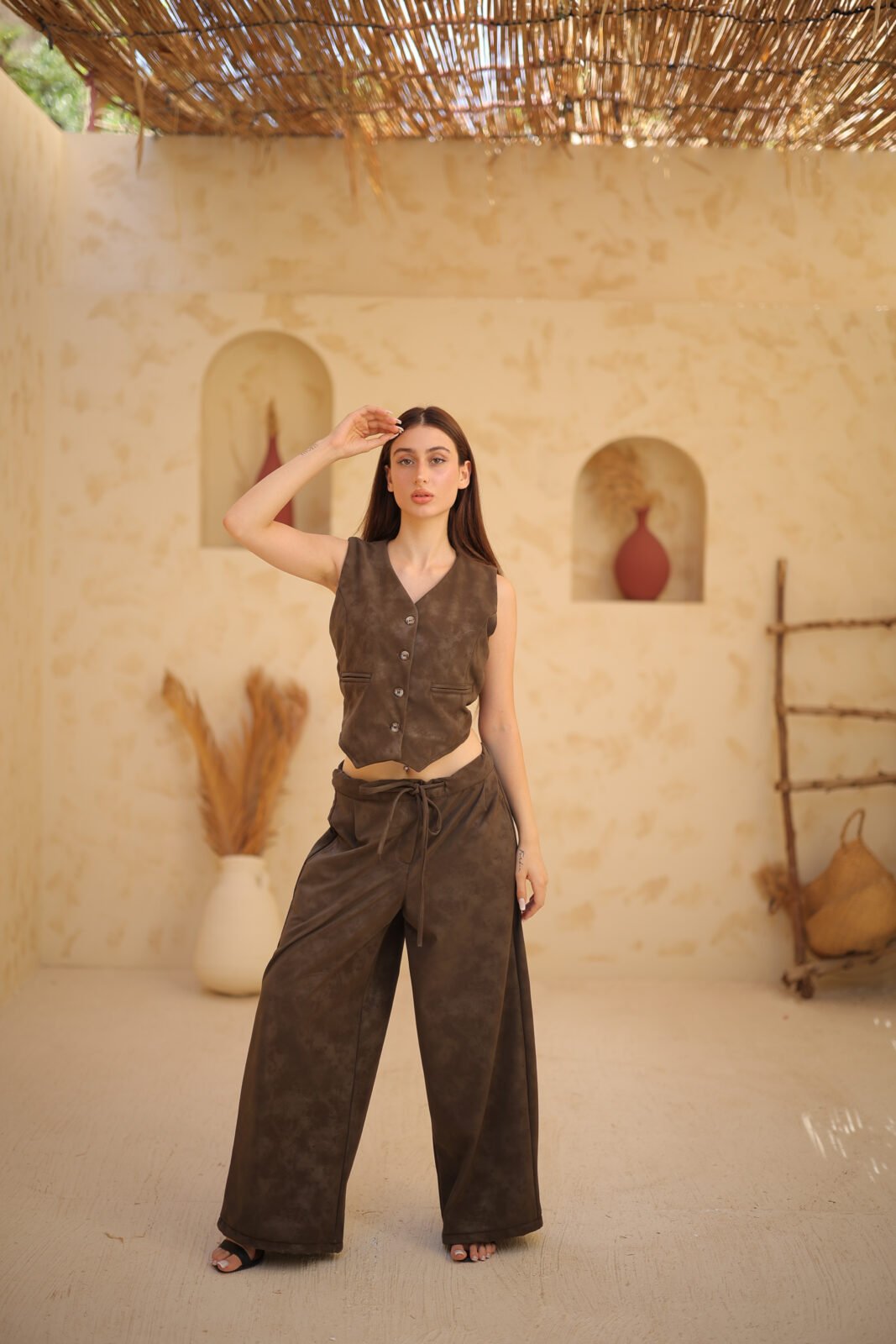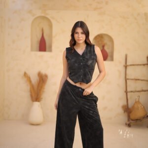 Sleeveless Suit — A bold and modern statement set featuring glossy leather fabric and a strong,